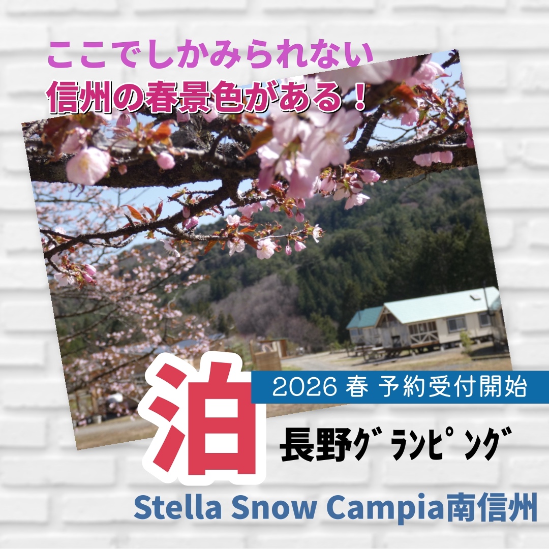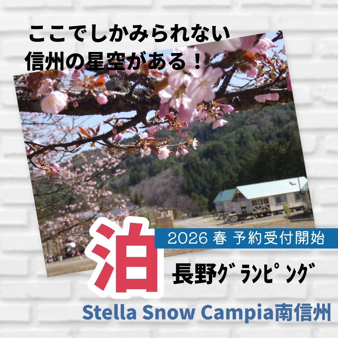 真冬の風景に包まれるはずのStella Snow Campia 南信州ですが、驚くことに現在ほど積雪なし(1/17現在)!そうは言っても2月にかけて寒波やってくることでしょう。この時期の空は澄んでいて、星空眺めるには最適、ご宿泊お気軽にお越し下さい。 さて、春の予約受付を開始しました。春のお出掛けお待ちしております。お問い合わせは、こちらまで! 愛知・静岡から最も近い南信州でのグランピング泊を、「Stella Snow Campia南信州/ステラスノーキャンピア」で体感下さい!