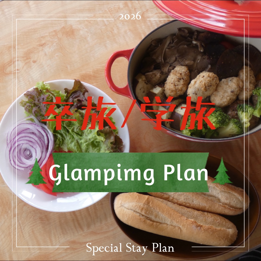 ~2025頑張った自分にご褒美! 厳選オードブル&スパークリングワイン付きグランピング泊プラン~ 厳選オードブルにfull bottle ワインなど(/2~3名様)付きで豪華に、お得にグランピング! 寒空の下星空を眺めながら、屋外テラスでいつもと違うセルフ調理を楽しみながら、おつまみとスパークリングワインで乾杯! ◇本プランのおススメ!◇=============================== ◆‘2025年末&2026年始の限定サービス’ご提供! (サービス)特典①-お薦め“スパークリングワイン(full bottle)”のご提供 特典②-“オードブル(3種盛り)”のご提供 (対象) 5日前までのご予約、20歳以上の宿泊者に限る (注意) 予約後、7日前からキャンセル料ご負担が発生いたします 利用日4日前以降の変更の場合、特典なし通常宿泊対応となります ※キャンセルの場合、代替として次回ご利用いただける同等額分のご優待券をお渡ししております(5日前までのご連絡者に限る)。 ※又、本プランには、美肌の湯“こまどりの湯”(自車で5分,休場日を除く)入浴券は付きません。